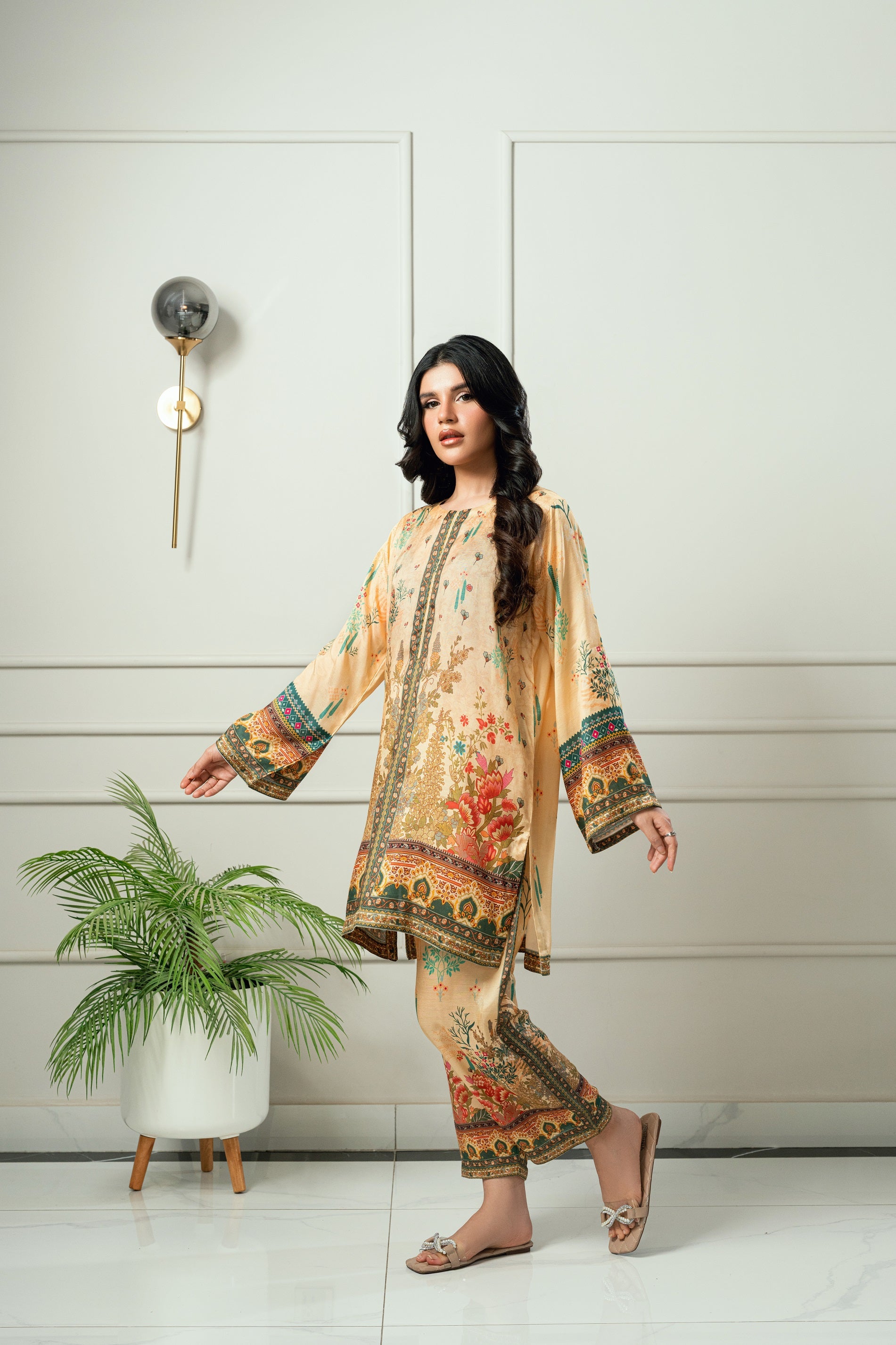 Amber Bloom is a radiant 2-piece set in premium blended cotton silk, featuring a warm amber base brought to life with vibrant floral and ornamental digital prints. Its rich hues and intricate borders create an effortlessly elegant look for any occasion.