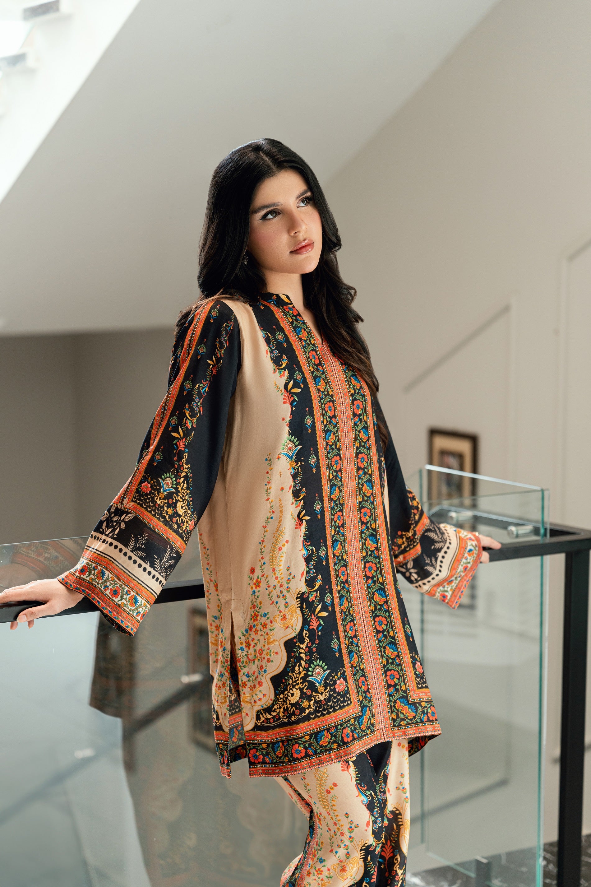 Make a statement with Dusky Charm, a blended cotton silk 2-piece in black, orange, and cream hues. Featuring intricate ethnic digital prints, this regular-fit shirt with straight trousers blends elegance and comfort—perfect for casual to semi-formal occasions. Color: A striking combination of black, burnt orange, and cream, highlighted with ornate motifs and border detailing for a regal touch.
