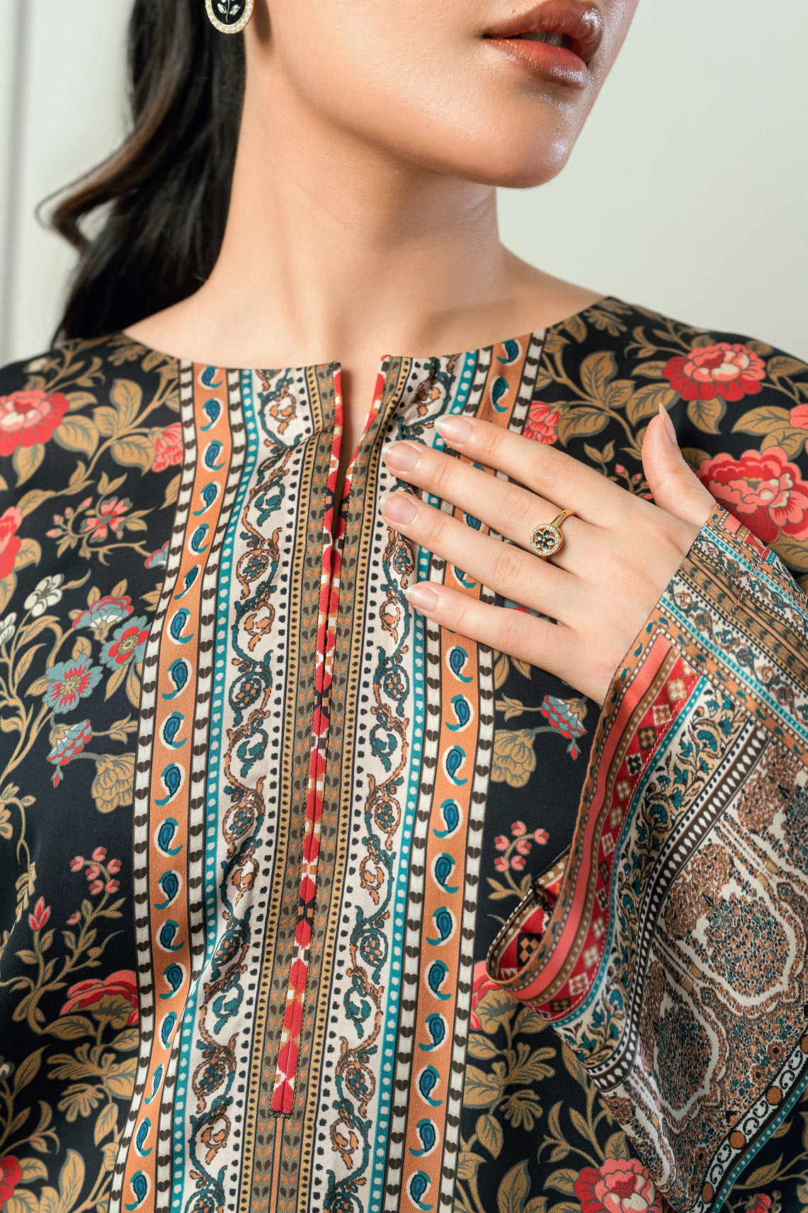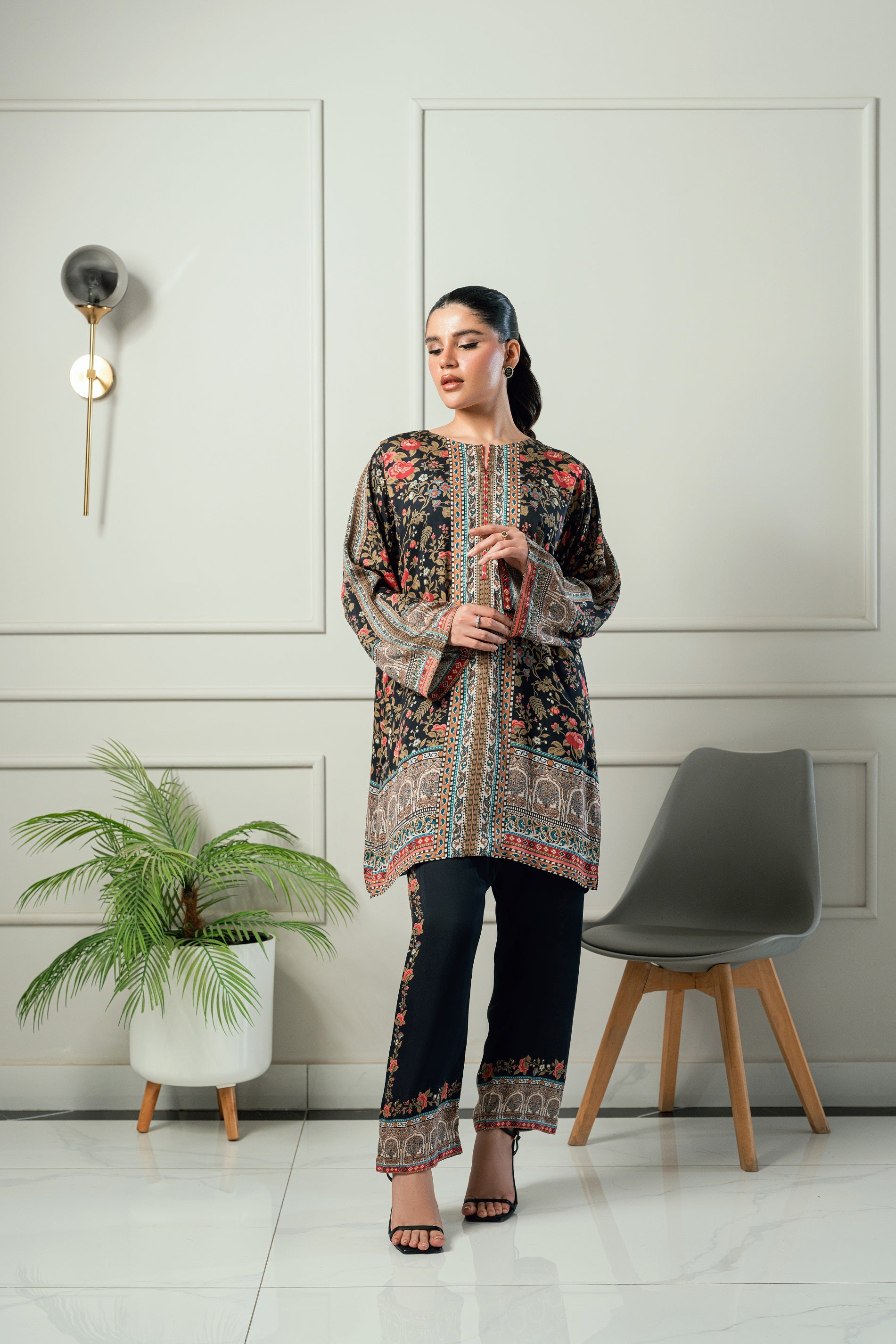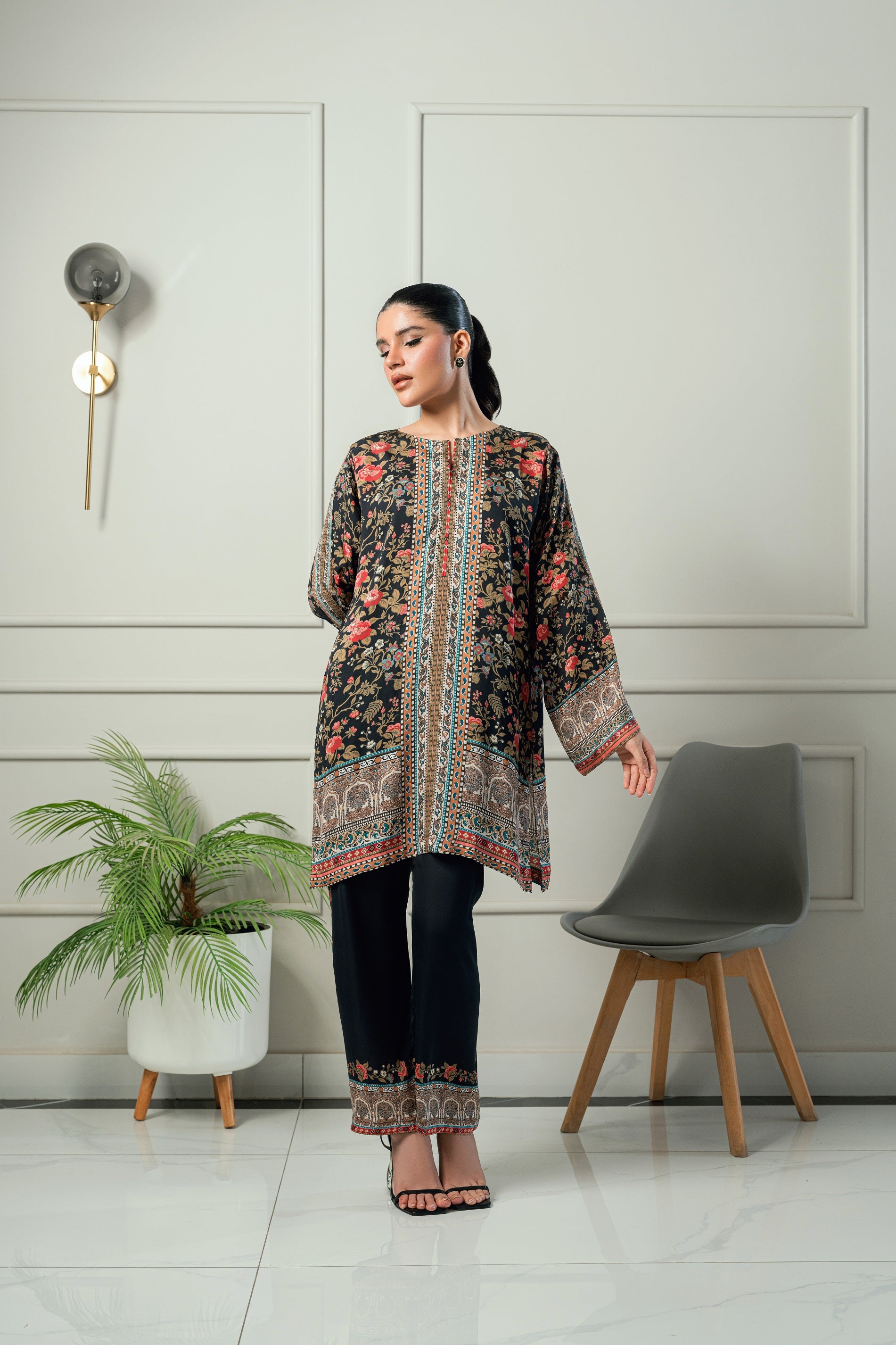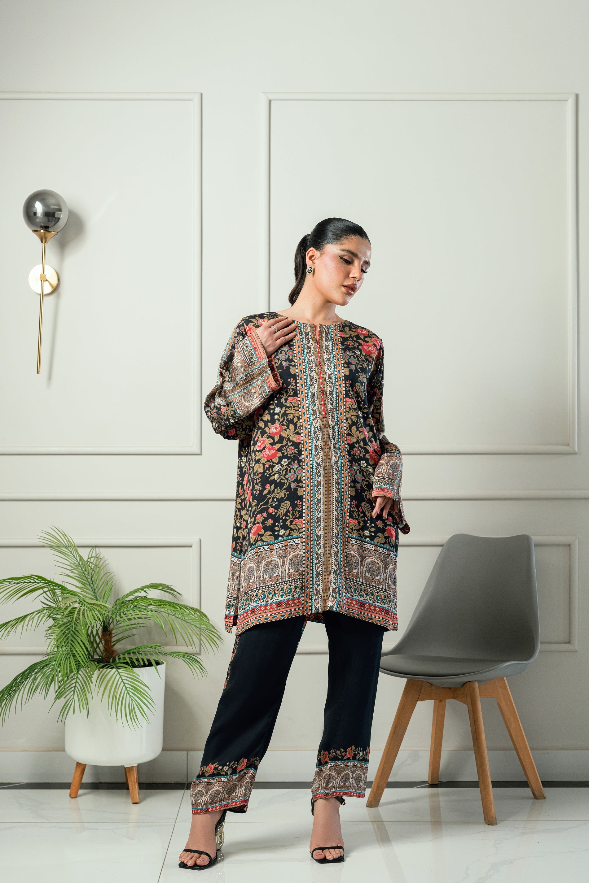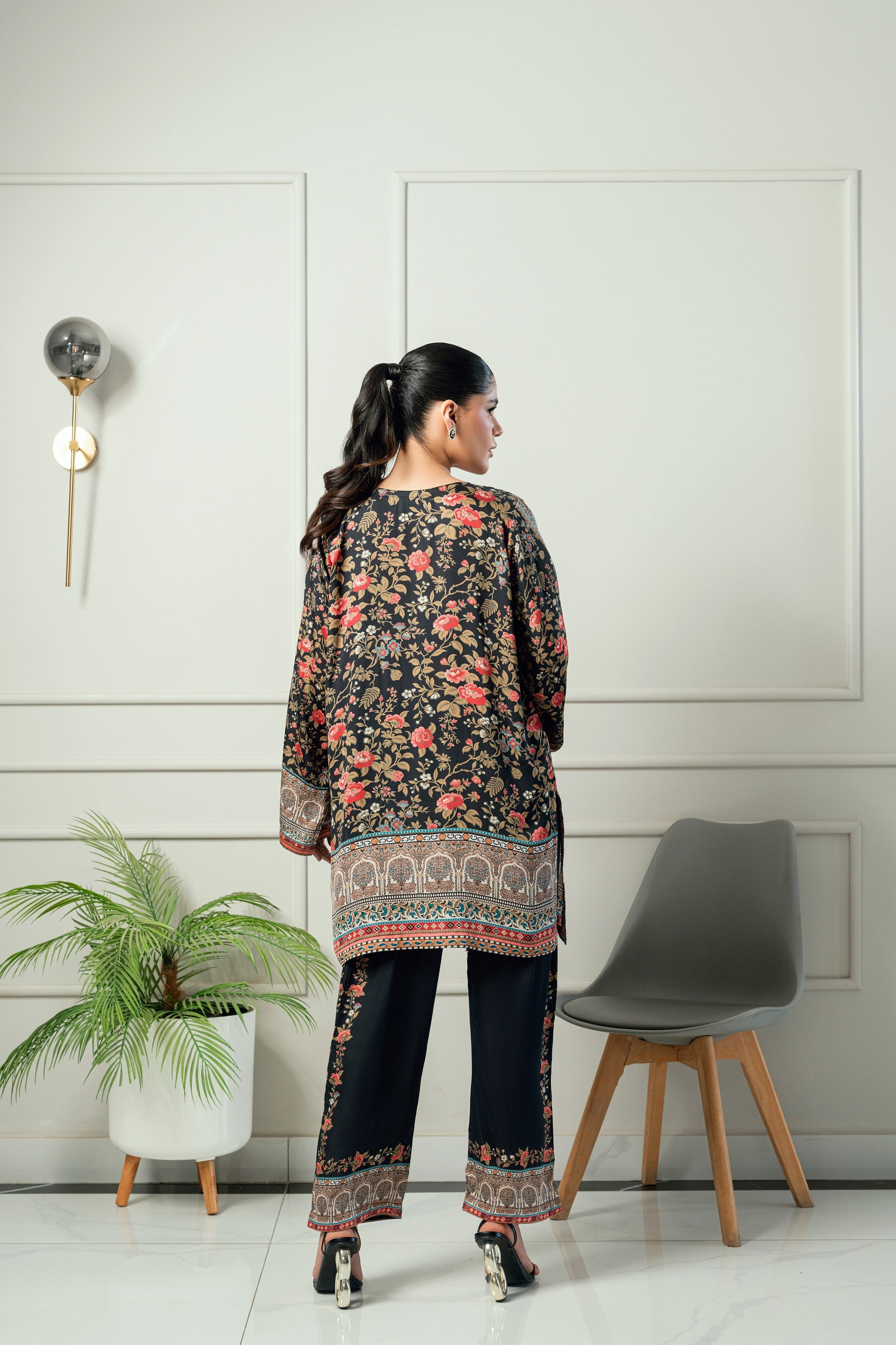Midnight Rose is a striking 2-piece set in luxurious viscose charmeuse silk, featuring a deep black base adorned with vibrant floral motifs and ornate border prints. Its bold yet elegant design makes it perfect for evening wear with a touch of timeless charm.