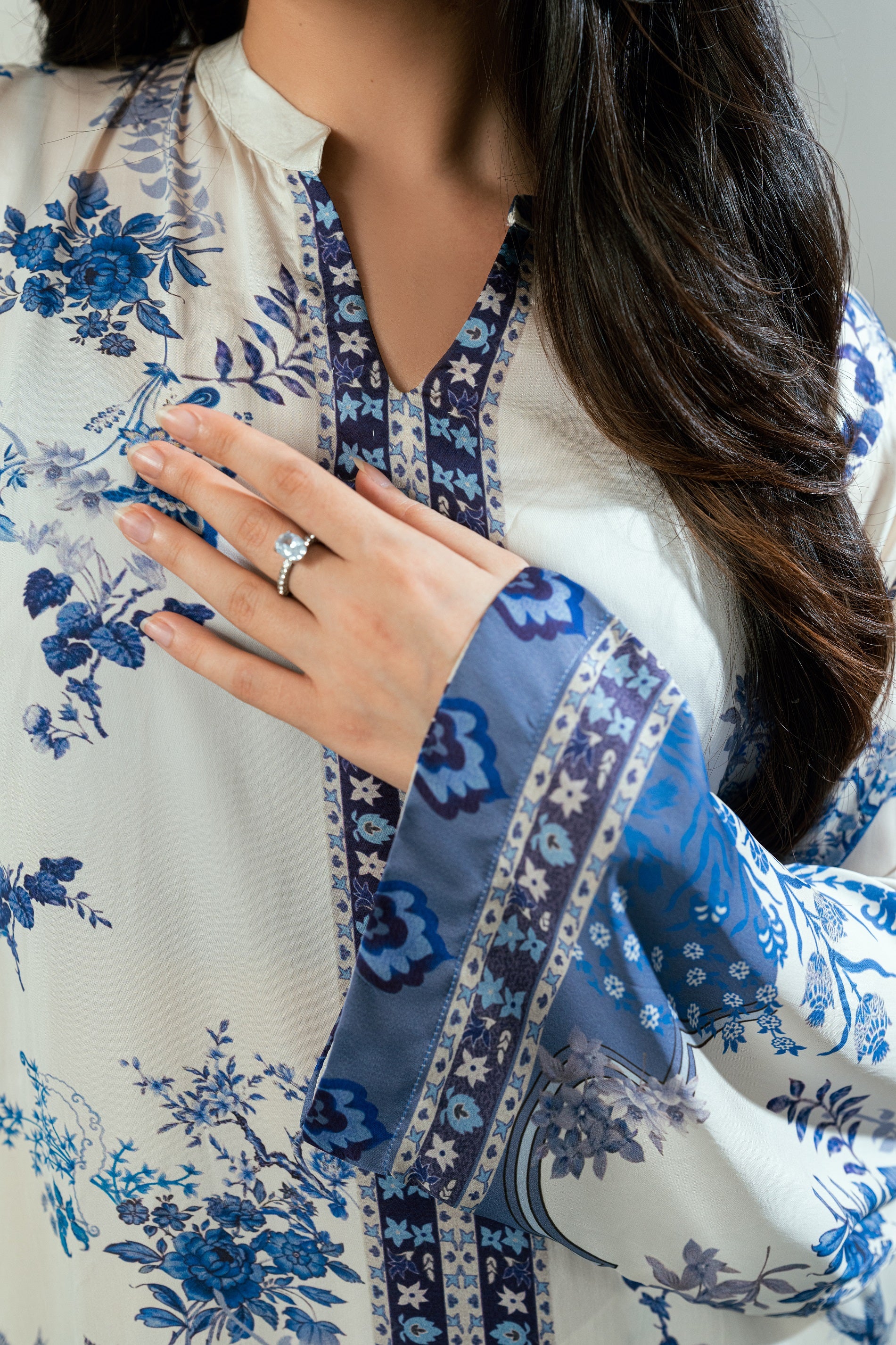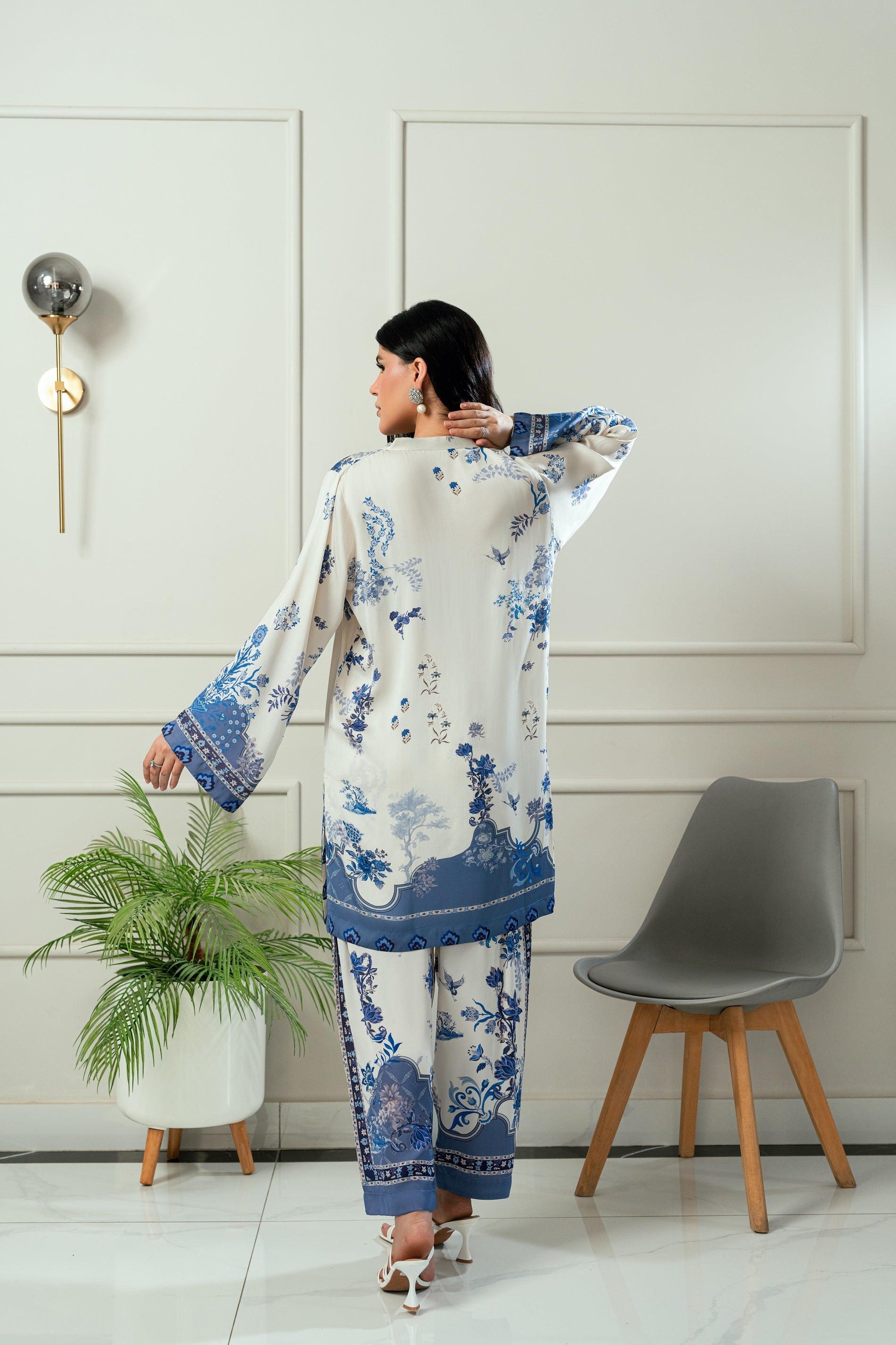 Ocean Bloom is a graceful 2-piece set in luxurious viscose charmeuse silk, featuring a soft ivory base adorned with serene blue floral and ornamental digital prints. Elegant yet comfortable, it’s perfect for both casual and semi-formal looks.